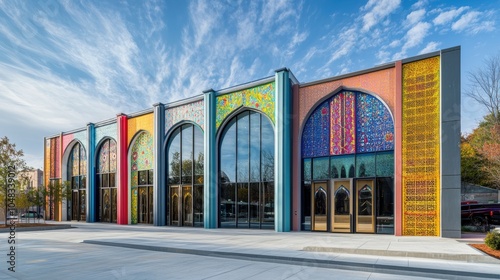 Colorful modern building with arched windows.