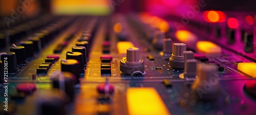 colorful music audio mixing board in closeup of a recording, audio track background in a dark recording, industrial machinery aesthetics, multimedia, selective focus, brightly colored