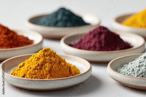 Colorful natural powders arranged in bowls showcase vibrant hues