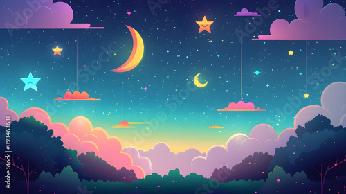 twilight, dreamscape, vibrant, celestial, fluffy, cloud, star, night, sky, colourful, moon, fantasy, magical, cosmic, illustration, cartoon, whimsical, astronomy, dusk, evening, galaxy, universe, space, dreamy, surreal, gradient, peaceful, serene, imagination, storybook, cute, adorable, playful, joyful, mystical, aethereal, heavenly, night time, scenery, atmospheric, tranquil, aglow, starry, astral, horizon, panoramic