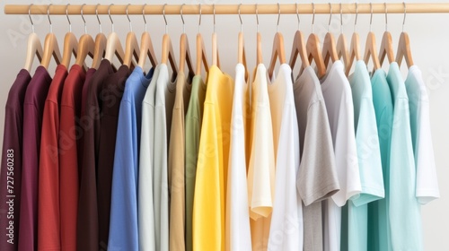 colorful of t-shirt with hangers in market, Fashion style. Neural network AI generated art