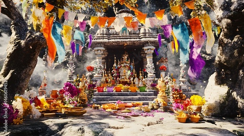 temple, shrine, colourful, offering, decoration, sacred, religious, nature, foliage, stone, architecture, asian, spiritual, worship, prayer, ritual, faith, devotion, altar, infuriated, flower, arrangement, vibrant, banner, flag, detail, structure, belief, exterior, sanctuary, design, light, shadow