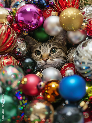 cat, kitten, christmas, ornament, bauble, ball, decoration, festive, holiday, pet, animal, red, silver, gold, blue, green, purple, eye-level, curious, closeup, party, celebration, decorative, seasonal, cheerful, merry, bright, shiny, domestic, background, wallpaper, template, greeting, new year, christmas, pet, animal, season, vertical, colourful, ornament, sphere, christmas ornament, bokeh