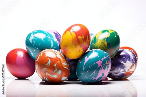 Colorful painted Easter eggs on white background with reflection. Studio shot.