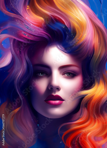 Colorful painting of a beautiful woman's face, Portrait of a beautiful woman with colorful hair