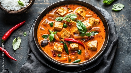 curry, tofu, vegetable, dish, vibrant, ingredient, favor, spice, cooking, meal, cookery, healthy, epicure, receipe, bowl, herb, basil, chili, garnish, presentation, comfort, vegetarian, style, plate, sauce, creamy, asian, spicey, culinary, platter, food, nourishment, fresh, enjoyment, warm, delightful, preparation, colours, serving, kitchen, table, crockery, festive, dining