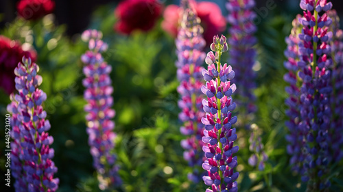 colorful panoramic floral background. lupine flowers in blurred emerald greenery with copy space. summer mood