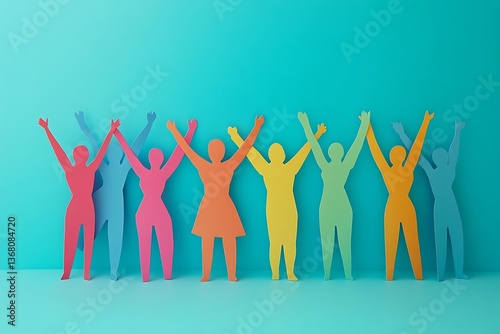 paper, people, figure, colourful, celebration, oneness, togetherness, teamwork, community, support, group, diversity, inclusion, success, achievement, joy, vibrant, bright, cheerful, optimistic, positive, uplifting, hopeful, playful, fun, silhouette, celebratory, standing, happy, woman, feminine, empowerment, strength, sisterhood, equality, solidarity, connection, bond, friendship, together, celebrate, achieving