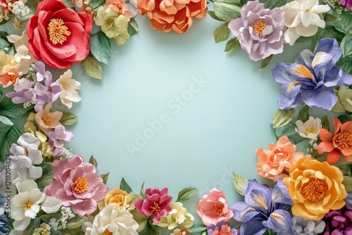 Colorful paper flowers arranged in a circular frame on a light blue background, leaving a central empty space.
