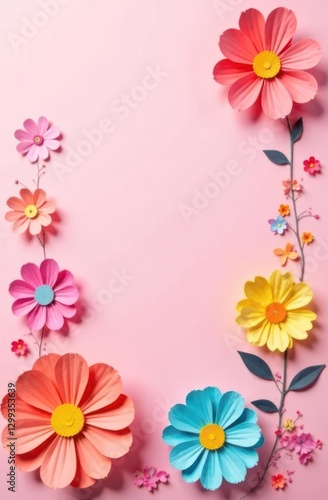colorful paper flowers arranged on pink background with copy space for text. vibrant floral design for spring celebrations. greeting card, invitation, mother's day poster.