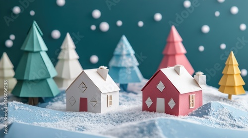 Colorful paper houses and snowy trees in a winter wonderland scene - winter concept