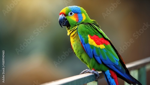 Colorful parrot perched on a railing. Bright feathers and vivid colors. Tropical bird with striking plumage.