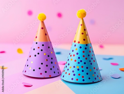 party hat, pois, birthday, joyful, happy birthday, party, colourful, lively, special occasion, hat, cheerful, illustration, graphic design, fun, festive, celebratory, confetti, background, bright, digital illustration, celebration, hat, pink