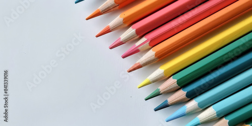 Colorful pencils neatly arranged in a diagonal row on a white background, showcasing a vibrant spectrum of hues ideal for art, creativity, and educational purposes..