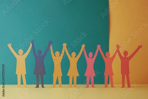paper, people, figure, colourful, celebration, oneness, togetherness, teamwork, community, support, group, diversity, inclusion, success, achievement, joy, optimistic, positive, uplifting, hopeful, bond, connection, collaboration, synergy, solidarity, friendship, cooperation, partnership, celebratory, harmonious, together, empowerment, strength, rainbow