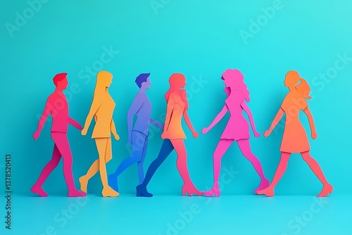 paper, people, figure, colourful, vibrant, bright, cheerful, optimistic, positive, uplifting, hopeful, playful, fun, creative, artistic, design, cut-out, walking, procession, parade, group, team, community, diversity, inclusion, togetherness, oneness, support, collaboration, movement, progress, forward, stride, journey, path, direction, step, silhouette