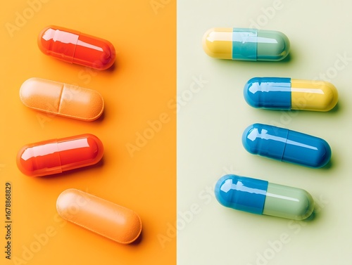 capsule, pill, medicine, pharmaceutical, health, medicals, drug, treatment, therapy, medication, vitamin, supplement, colours, bright, vibrant, background, cleaving, orange, yellow, green, blue, red, white, studio, shot, overhead, flat, lay, clean, modern