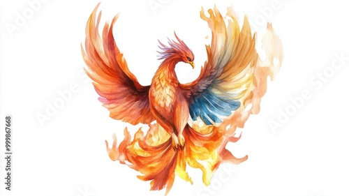Colorful phoenix illustration with fiery wings on a white isolated background.