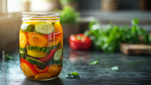 Colorful pickled vegetables in a glass jar on a table.
