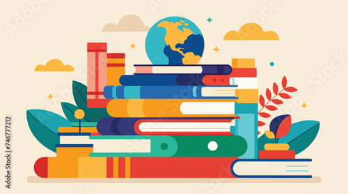 vector, illustration, education, book, globe, learning, stack, colourful, cognition, literature, international, growth, leaf, cloud, background, warm, tone, study, reading, symbolism, decorative, boundless, stylised, design, art, school, academic, library, global, pile, intellectual, culture, nature, wisdom, understanding, discovery, earth, vibrant, resource, nirvana, environment, artistic, ornamental, collection, expansion, rich, colours