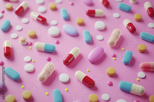 Colorful Pills and Tablets Scattered on Pink Background Pharmacy Concept