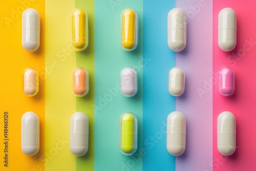 Colorful pills are organized on background with vertical stripes. It is for pharmaceutical, health, or dietary supplement advertising.
