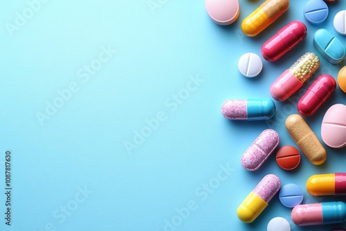 Colorful pills scattered on a blue background. Clean layout with space for text. Perfect for medical or healthcare themes.