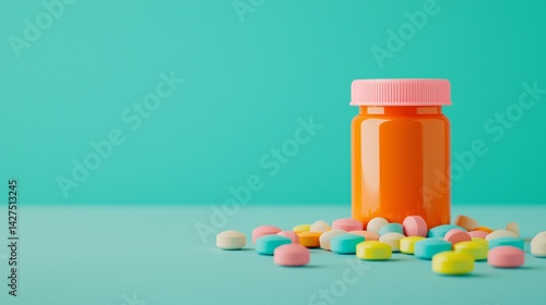Colorful Pills Spilled from Orange Medicine Bottle on Teal Background
