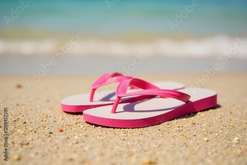 Colorful Pink Flip Flops on Sandy Beach with Clear Blue Ocean in the Background, Perfect for Summer Vacation and Relaxation Themes