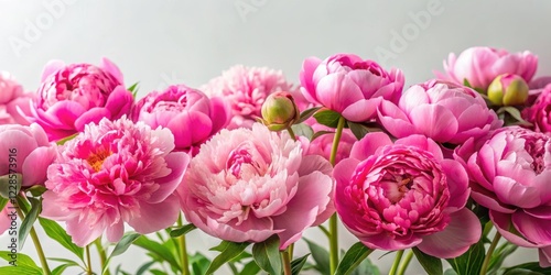 Colorful pink peonies in full bloom against a soft white background , flower field,