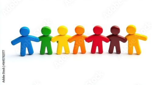 Colorful Plastic Figures Holding Hands in a Line on White Background
