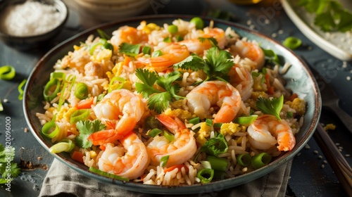Colorful plate of Chinese-style fried rice with shrimp, eggs, and mixed vegetables, garnished with fresh cilantro and green onions.