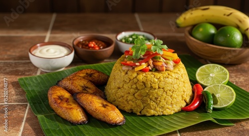Colorful Plate of Traditional Rice Dish with Plantains, Fresh Ingredients, and Spices on Decorative Banana Leaf Serving
