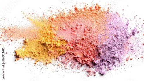 powder, colourful, explosion, make-up, cosmetic, orange, yellow, pink, purple, beauty, texture, scattered, abstract, vibrant, blend, multi, pastel, loose, dry, pigment, powdery, soft, smooth, high, contrast, white, background, top, view, flat, product, many-coloured, make-up, cosmetic, illustration, detail