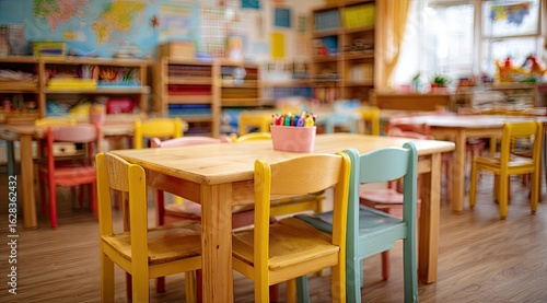 preschool, classroom, colourful, kindergarten, learning, children, education, table, chair, wooden, desk, study, toy, book, bookshelf, activity, supply, crayons, art, children, play, vibrant, bright, pink, yellow, blue, green, pastel, warm, light, organised, environment, school, childhood, early, future, development, fun, happy, room, interior