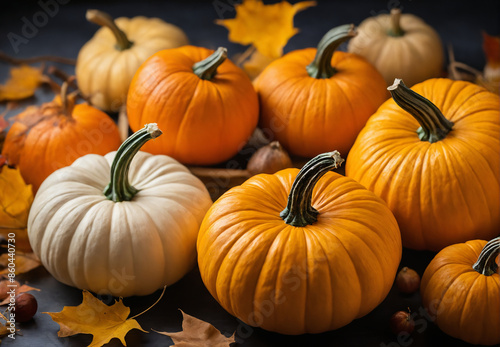 pumpkin, autumn, fall, leaf, season, orange, white, harvest, thanksgiving, nature, table, still life, closeup, decorative, gourd, vegetable, decoration, vibrant, colourful, foliage, yellow, brown, red, rustic, seasonal, festive, cosy, natural, background, display, autumn, scene, decor, arrangement, centrepiece