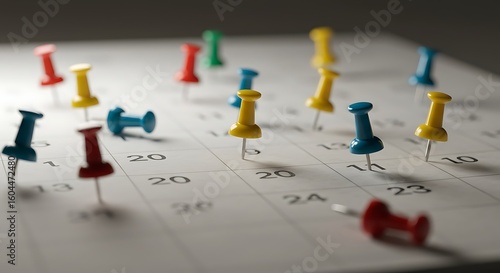 calendar, drawing pin, date, planning, scheduling, event, reminder, deadline, organisation, appointment, yellow, red, blue, green, white, marking, closeup, day, month, grid, number, organizing, meeting, sharpened, time management, task, business, personal, control, target, objective, event