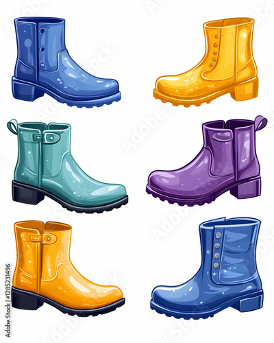 boot, rain, colourful, autumn, fashion, collection, shoe, rubber, footwear, style, woman, girl, spring, water, apparel, clothing, rainy, weather, accessory, design, illustration, graphic, vibrant, bright, trendy, elegant, stylish, comfortable, waterproof, protection, casual attire, modern, texture, pattern, glossy