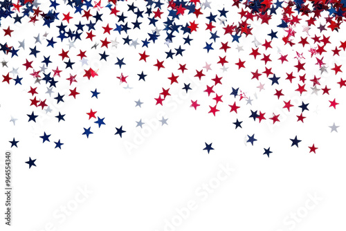 Colorful red, white, and blue star-shaped confetti scattered on a transparent background. Perfect for festive and celebratory themes.