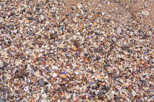 Colorful red yellow purple rebble and seashells on beach jackstone Australia Sunshine Coast Queensland