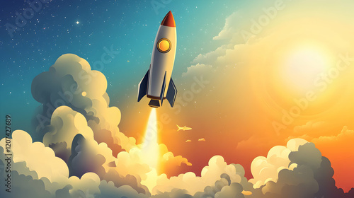 rocket, launch, sky, cloud, sunrise, orange, blue, space, adventure, technology, exploration, atmosphere, vignette, bright, cartoon, digital, futuristic, propulsion, emission, sunlight, design, journey, travel, scene, imaginative, concept, innovation, fantasy, aerial, universe, flight, vibrant, movement, power, artistic, beauty, colourful, illustration, creative, isolated, bold, excitement, thrill, rise, science