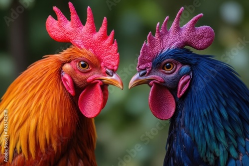 Colorful Roosters Facing Each Other with Vibrant Plumage Details