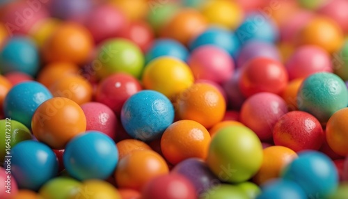 Colorful round candy balls fill frame, playful mix of vibrant rainbow hues. Glossy spheres, in assorted shades of green, blue, orange, pink, yellow, create cheerful, eye-catching confectionery