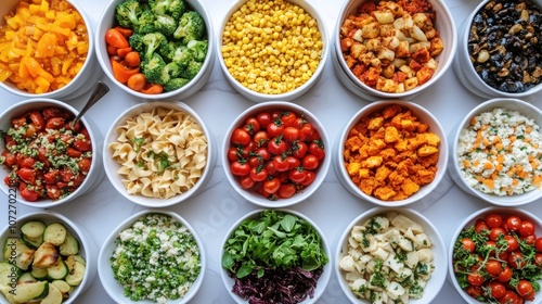 salad, ingredient, food, fresh, vegetable, bowl, bar, cookery, healthy, diet, nourishment, colourful, tomatoes, corn, broccoli, courgette, pasta, white, yellow, red, green, delicious, dinner, lunch, epicure, vegan, vegetarian, organic, natural, tasty, variety, eatery, buffet, catering, choice, kitchen, table, top, overhead, view