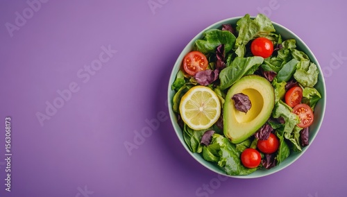 salad, bowl, vegetable, avocado, lemon, cherry, tomatoes, greener, healthy, fresh, alimentary, diet, food, delicious, eating, meal, colourful, vibrant, purple, background, organic, vegetarian, vegan, lunch, dinner, cookery, nourishment, freshness, spring, summer, receipe, ingredient, topping, portion, plate, produce, closeup, top, view, simple