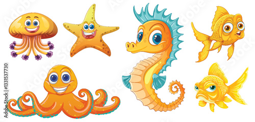 marin, sea, ocean, animal, creature, illustration, vector, colourful, vibrant, cartoon, jellyfish, starfish, seahorse, fish, octopus, aquatic, underwater, nature, wildlife, expressive, fun, playful, art, design, creativity, fantasy, imagination, character, animation, drawing, cute, friendly, ecosystem, environment, happy, smiling, marketing, advertising, graphic design
