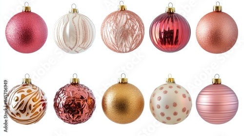 Colorful set of Christmas ball ornaments in various designs arranged on a white background perfect for festive holiday decoration themes