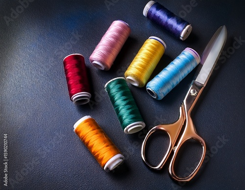 colorful sewing threads and scissors on dark background