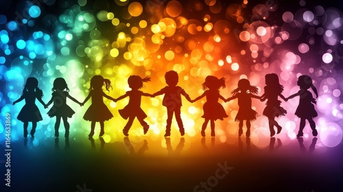 silhouette, children, colourful, vibrant, background, bright, light, oneness, joy, celebration, happy, together, fun, play, diversity, artwork, creativity, imagination, community, harmony, friendship, dance, playful, motion, expressive, cheerful, group, many-coloured, shine, glow, whimsical, festive, beauty, energy, youth, innocence, connection, colours, spirit, warmth, moment, togetherness, artistic, design, illustration
