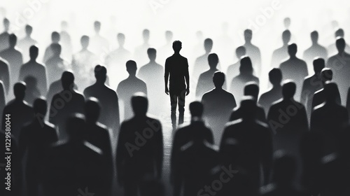 Colorful silhouette pf person standing in monochrome crowd of different people,surreal unique and different concept,loneliness in society,shadow,freedom,Love,be yourself,Stand out from the crowd.